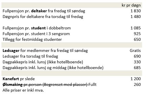 Æres-, pensjonist- og studentmedlemmer betaler ingen konferanseavgift, men for festmiddag og overnatting i hht egen avtale.